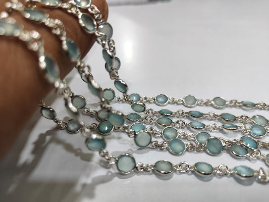 Natural Blue Aqua Chalcedony Briolette Coin Shape 6mm Bezel Connector Chain Sold Per Foot